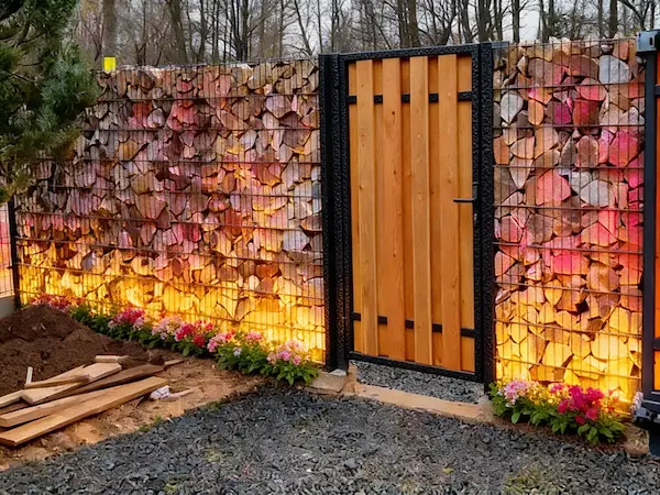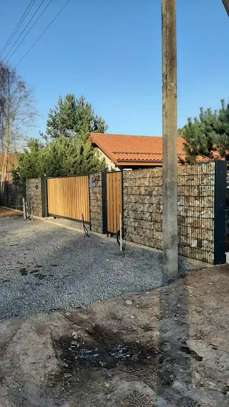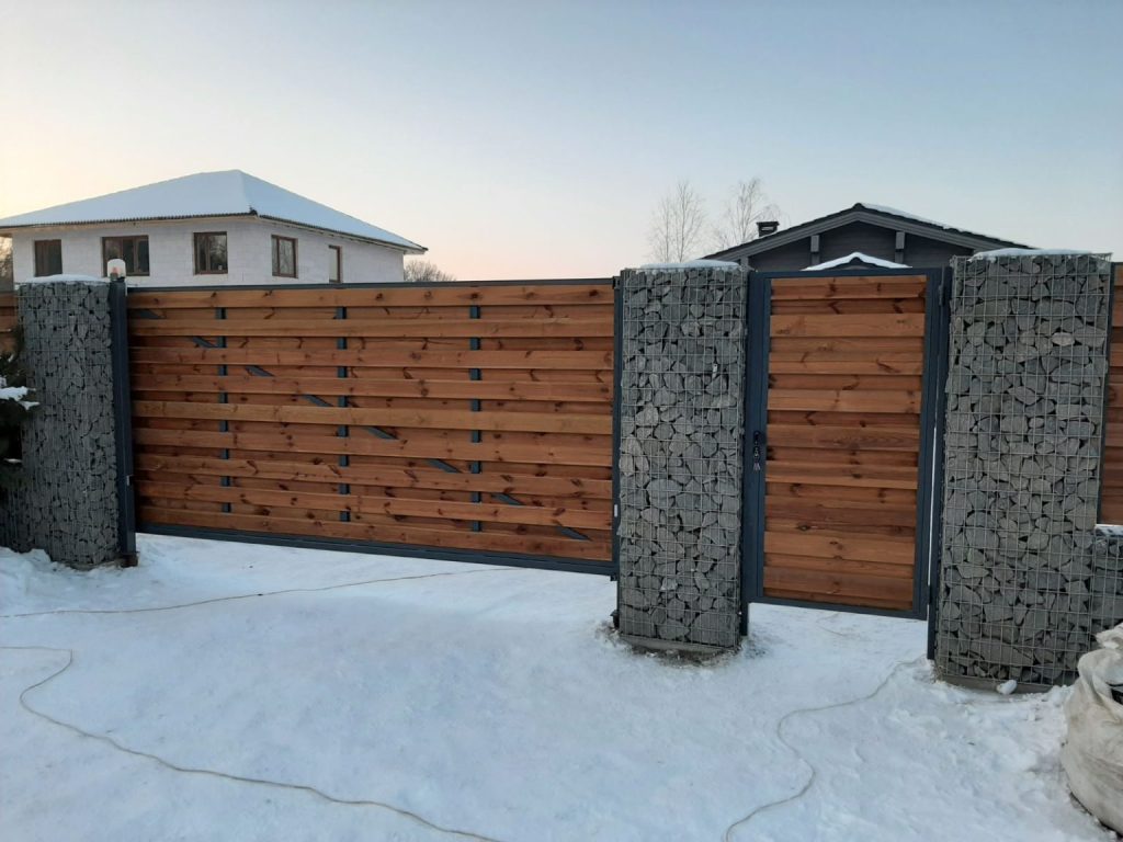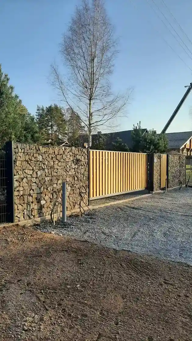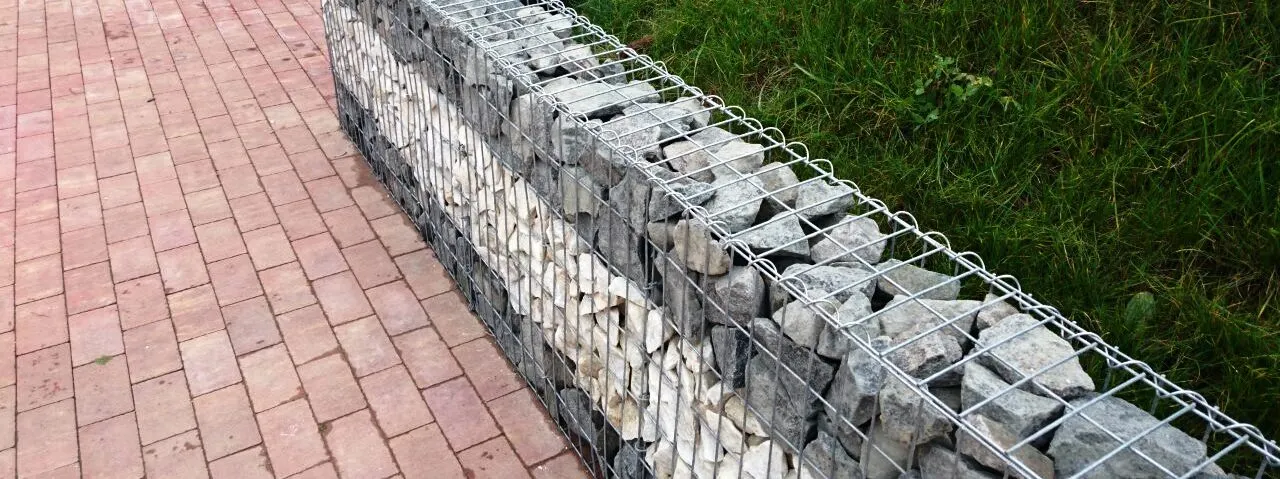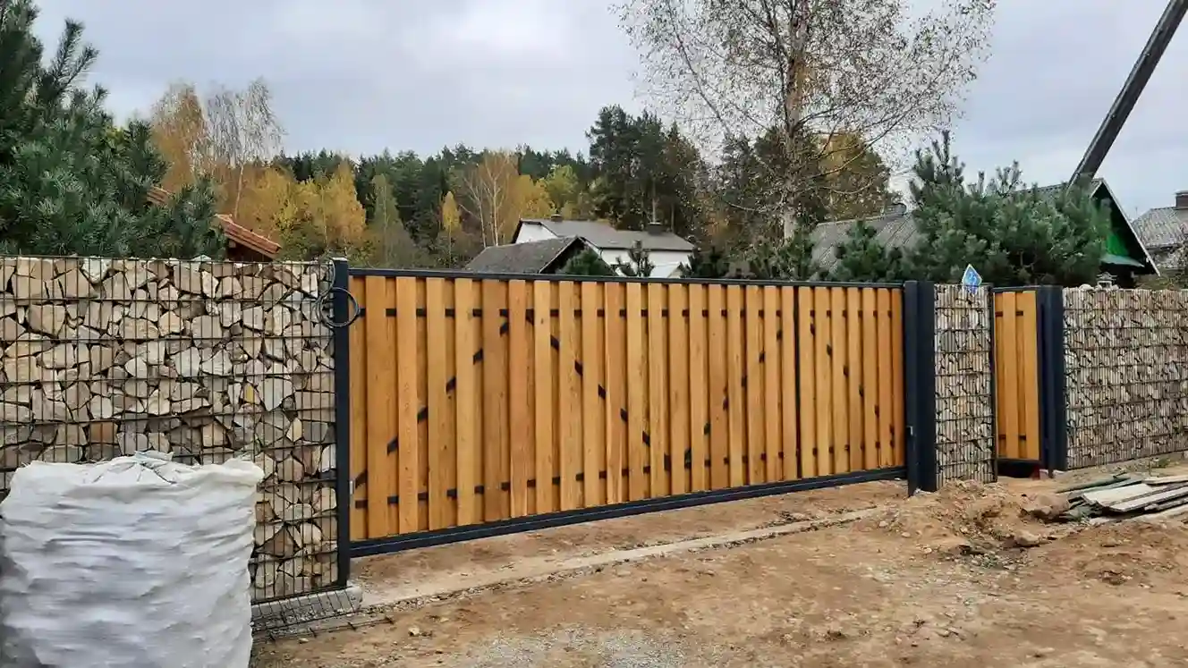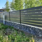 - Габионы — массивно и красиво: камень + оцинкованная сетка, можно комбинировать с металлом.