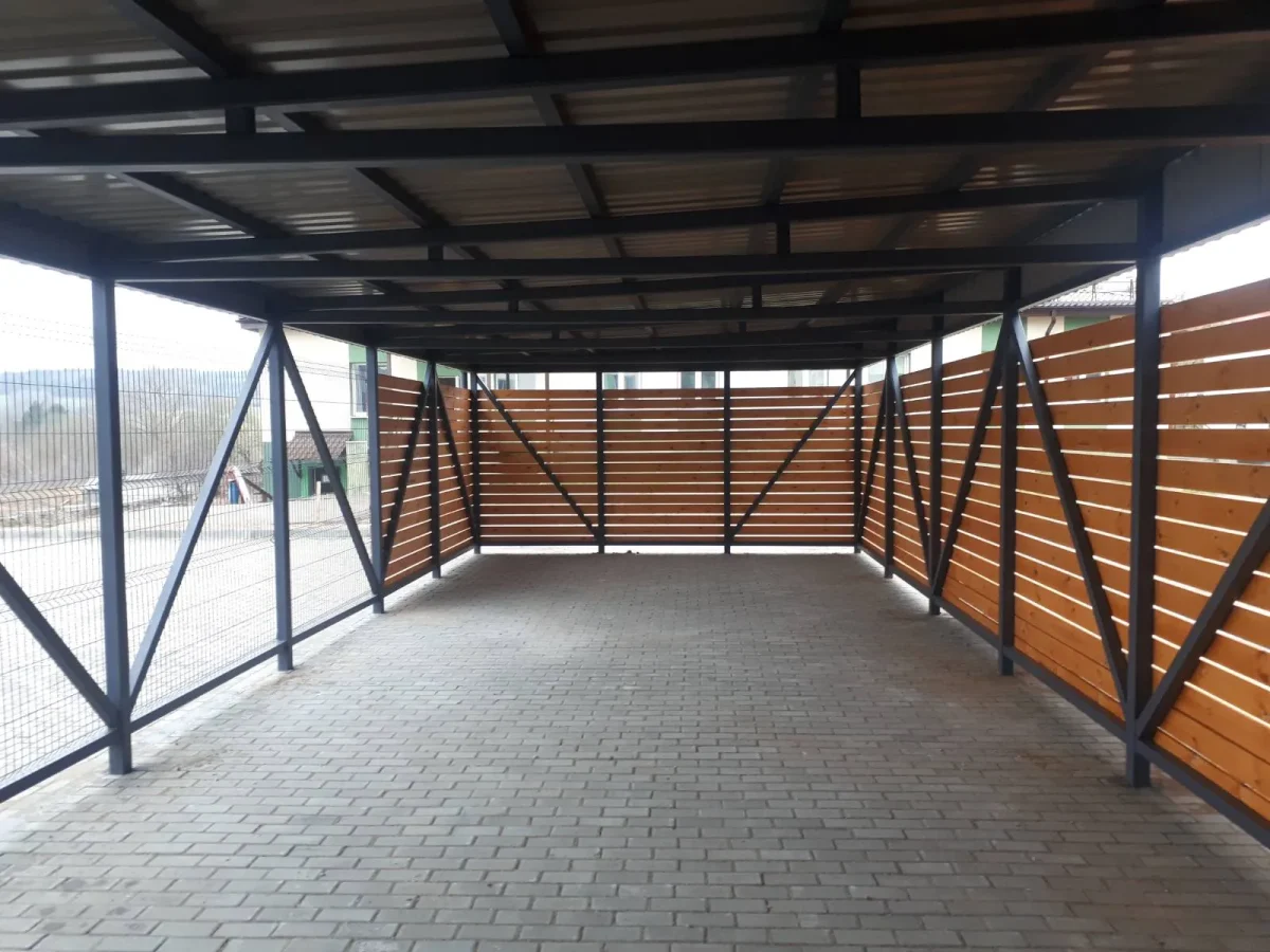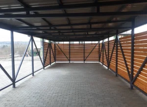 - Навес из профнастила или поликарбоната — защищает от дождя, снега и прямых солнечных лучей;