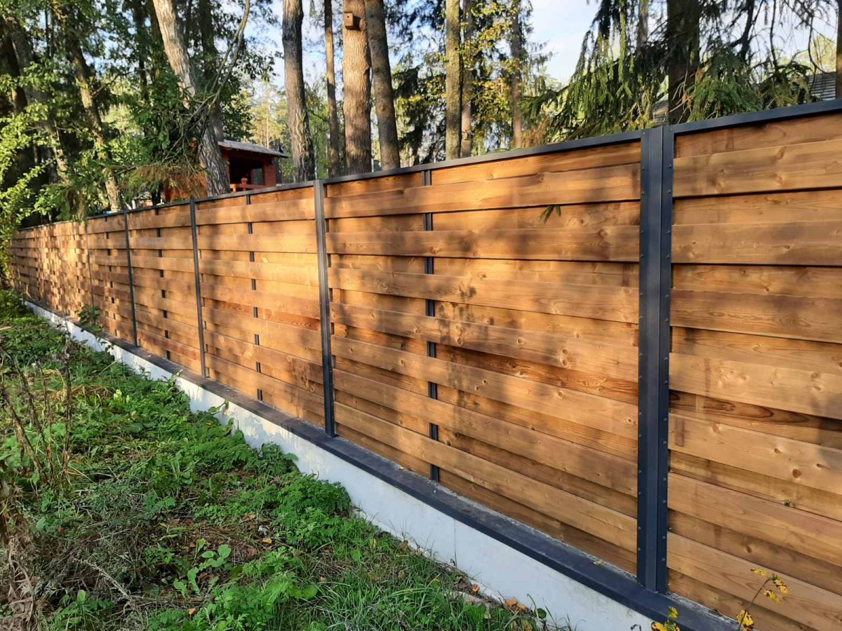 Двухсторонний забор «Ранчо» — это эстетичное и практичное решение для участков, где важны приватность, долговечность и современный дизайн. Полосы евроштакетника монтируются горизонтально с двух сторон лаг с шахматным смещением: так достигается высокая декоративность и закрытость без «сплошной стены», остаётся проветривание и светопроницаемость.